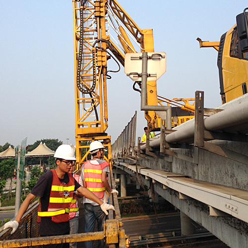 桥梁检测车广泛适用于大中型桥梁的病害维修和预防性检查作业,如对大桥下面各结构进行全面的检查、维修与维护(油漆、喷砂、安装、拆卸),包括对大桥主梁梁底裂纹检测和全桥支座检查养护,也可以安装和维护桥下管道和电缆。