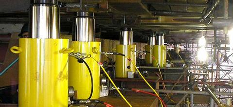 千斤顶及油泵校验:为了满足顶升同步的要求,千斤顶宜采用统一型号。为了保证顶升时梁体受力均匀,在同一组千斤顶底下均垫300×300×30mm钢板,顶面垫钢梁,千斤顶必须支顶在腹板位置上,千斤顶安放必须平稳。所有千斤顶及油泵进场前均应进行标定。